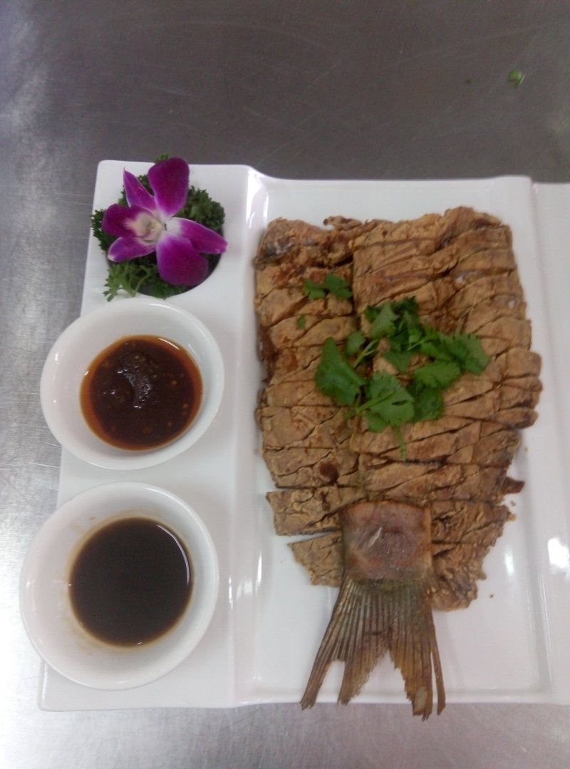 4:煎锅上火放色拉油烧至7成热,鱼肉去掉元葱花椒拍干粉煎,至熟后.切成长条摆盘,配酱汁即可