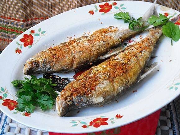 6:煎制到一面定型后,翻面再煎。先把烧烤料均匀的撒在鱼的表面。