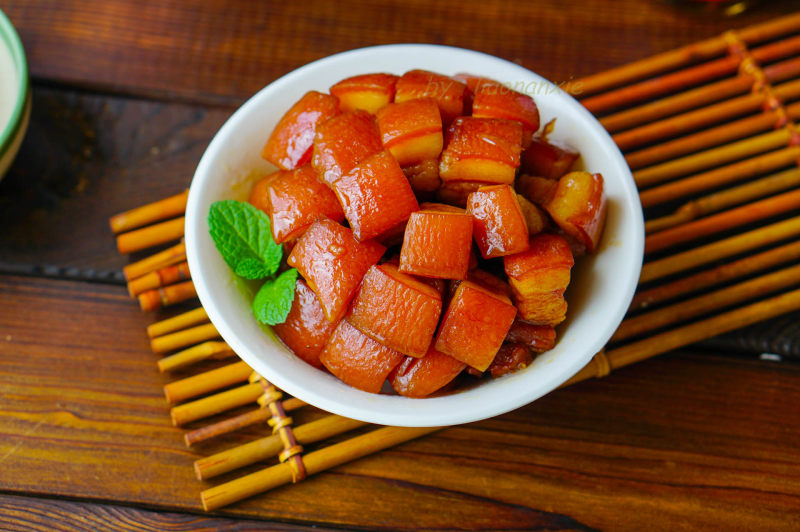 10:最后装盘上桌趁热享用吧。取一个大小合适的碗,把烧好的肉块肉皮向下码整齐,再扣入深盘中,可以摆出造型,好看又好吃。