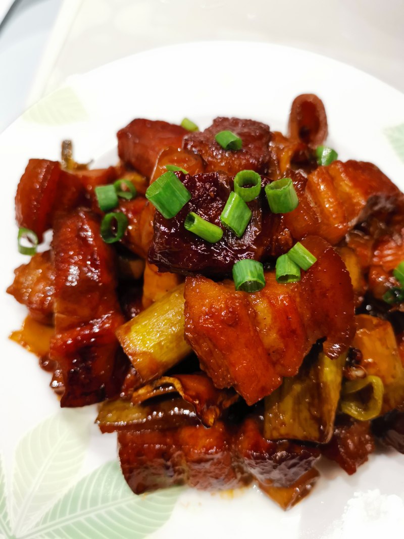 今天的红烧肉,没有添加香料,烧出来也非常好吃,也可以加一小量八角、桂皮和香叶来提升整个菜的香气。五花肉在小火慢炖的过程中,肥油被慢慢逼出来,肉块也因此变小,收汁后锅中可以看到一些油脂,用吸油纸或者汤勺舀出来,这样可以少吃一些油。一口大小的五花肉,并不适合久煮,因为煮太久肉会化掉,完全没有口感也不好吃了。
