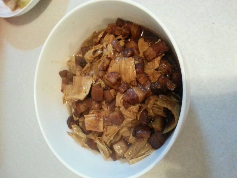 4:肉好了之后加入腐竹微炖一会,腐竹要之前泡好的