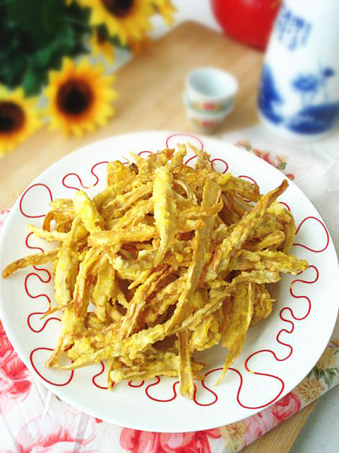 3:上锅加入适量油烧热,将菇片粘满面浆,放入油锅里炸至金黄色即可。