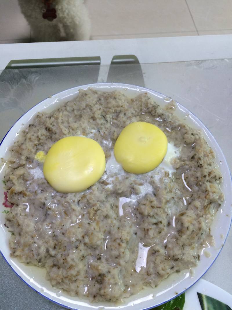 4:梅菜干揉干后剁碎,同样放入锅内。同时加入一个鸡蛋清和一茶勺花生油