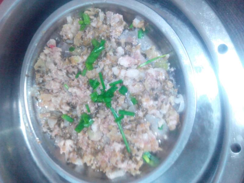 6:炒出香味的梅干菜和凉薯一起放入肉馅中