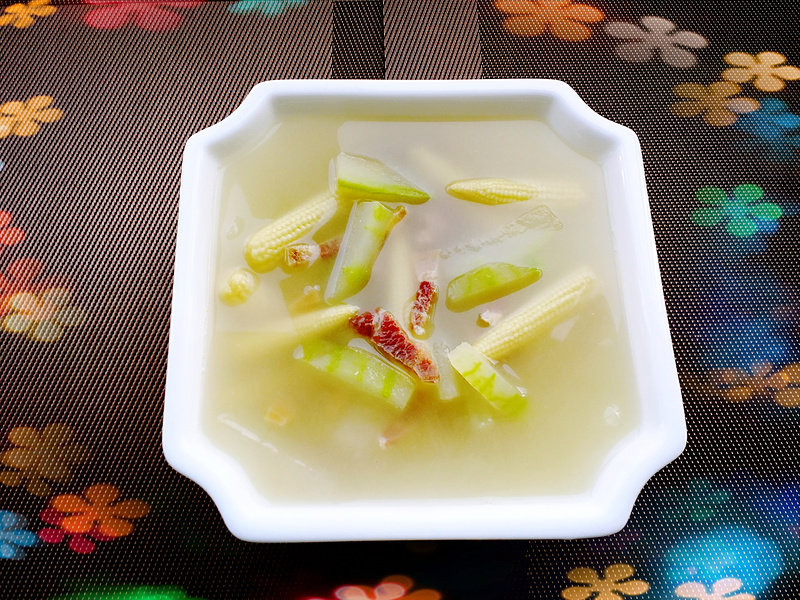 3:一碗营养丰富、口味独特的玉米笋冬瓜汤做成了:冬瓜似绿玉,玉米似笋尖,汤中有玉米的甜香,冬瓜的清香,火腿的肉香。一口汤含在嘴里清香中带咸鲜,缓缓下肚,治愈了你一天的工作疲劳。