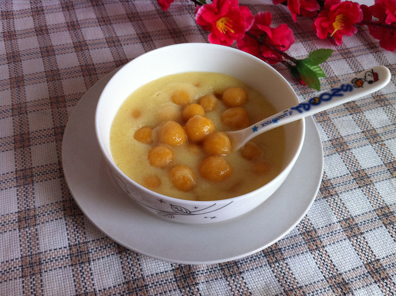 9:南瓜糯米球煮熟,将玉米面糊倒入煮锅里