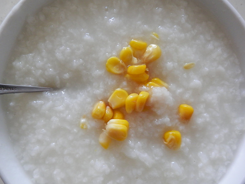 3:把蒸熟的玉米剥粒,放入煮好的白粥中,略煮就好