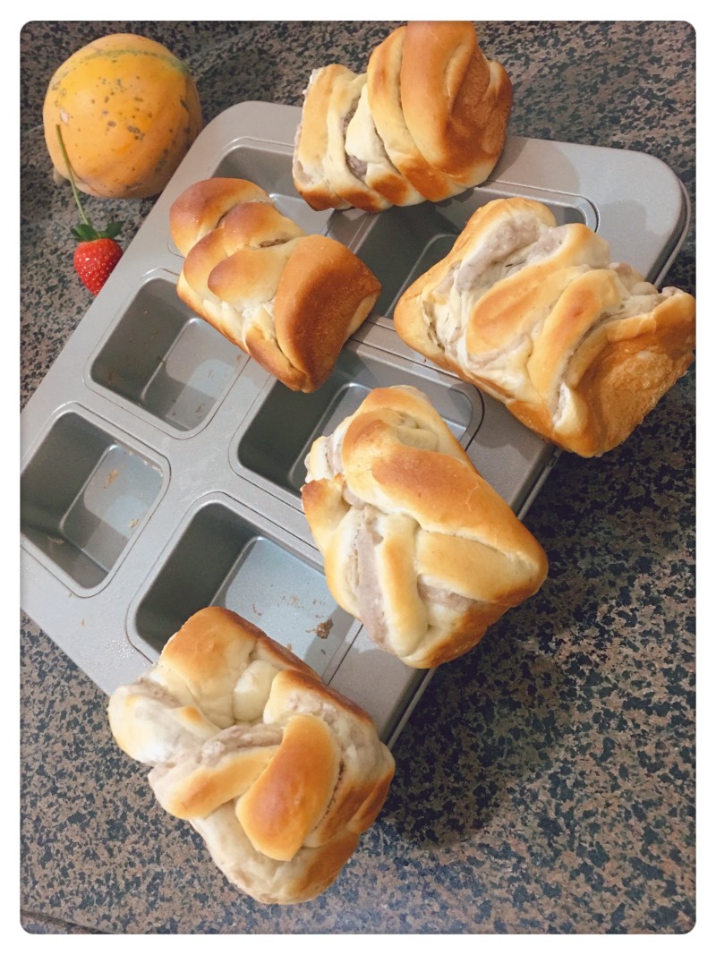 21:包起,收口向下,放入抹油的蛋糕模中,最后发酵30分钟