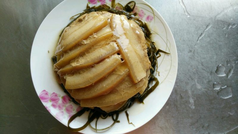 6:码好的肉上面放上海带丝,准备上锅蒸制,开锅后蒸一个半小时就好了,