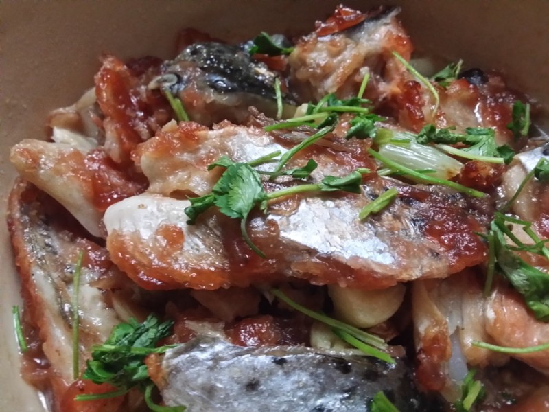 11:水汽烧干后,关火,撒上香菜,美味的三文鱼头煲做好了。