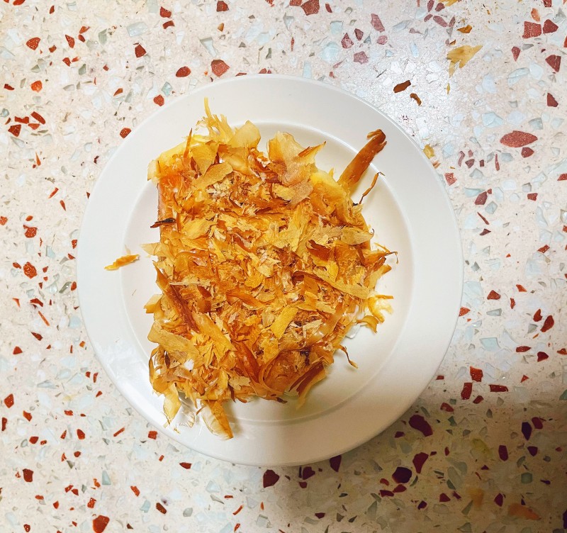 4:倒入柴鱼皮略炒一下