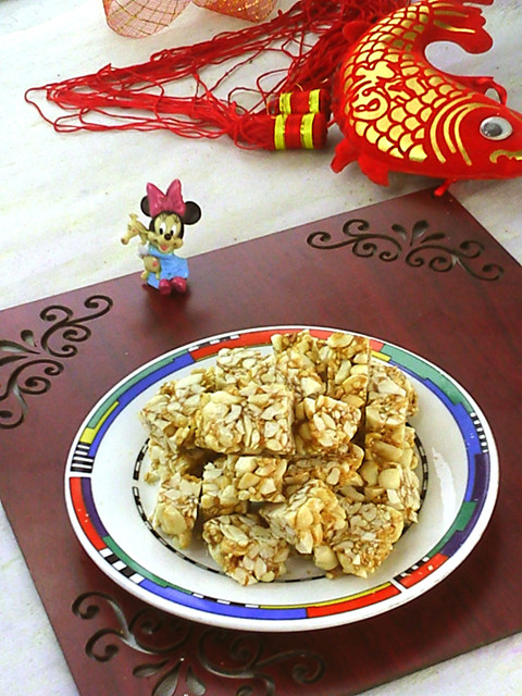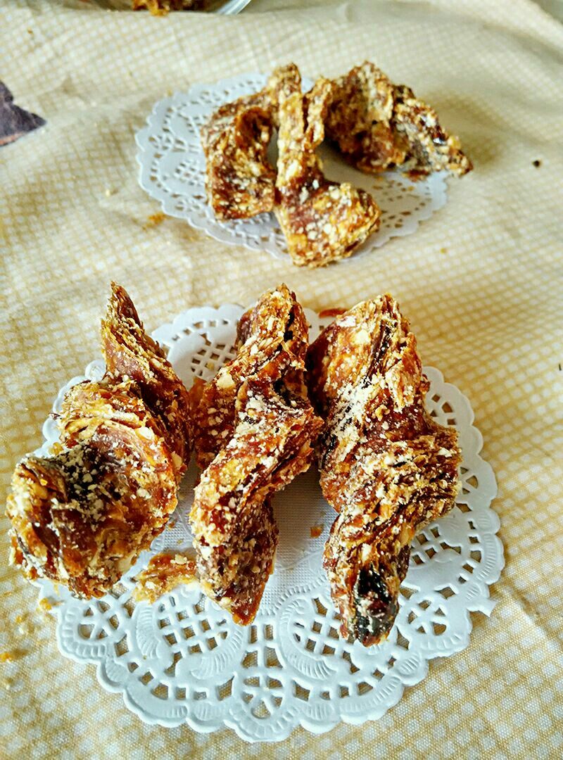 9:擀好的花生糖一定要趁热切块,因为等放凉了再切很容易碎的;切完装盘即可,香香脆脆好味道~~~
