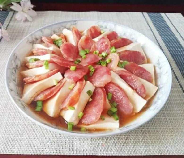 3:上锅蒸10分钟,出锅撒葱花,香肠蒸豆腐就做好了。