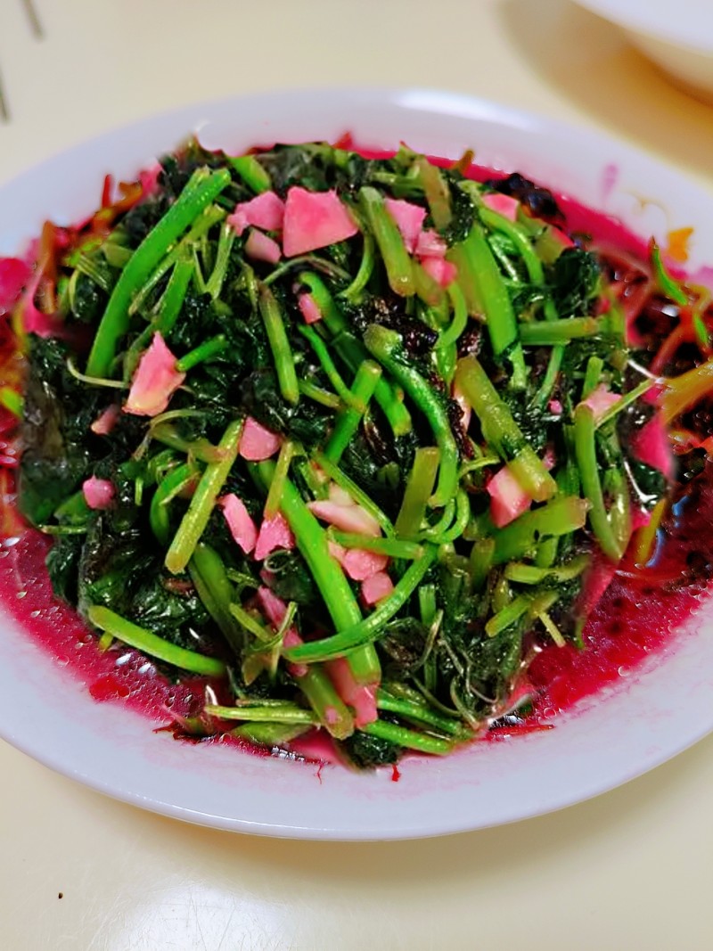 4:然后,合入已清洗好的红苋菜翻炒翻炒。