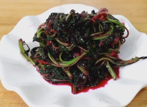 4:接着,已清洗好的红苋菜翻炒翻炒。