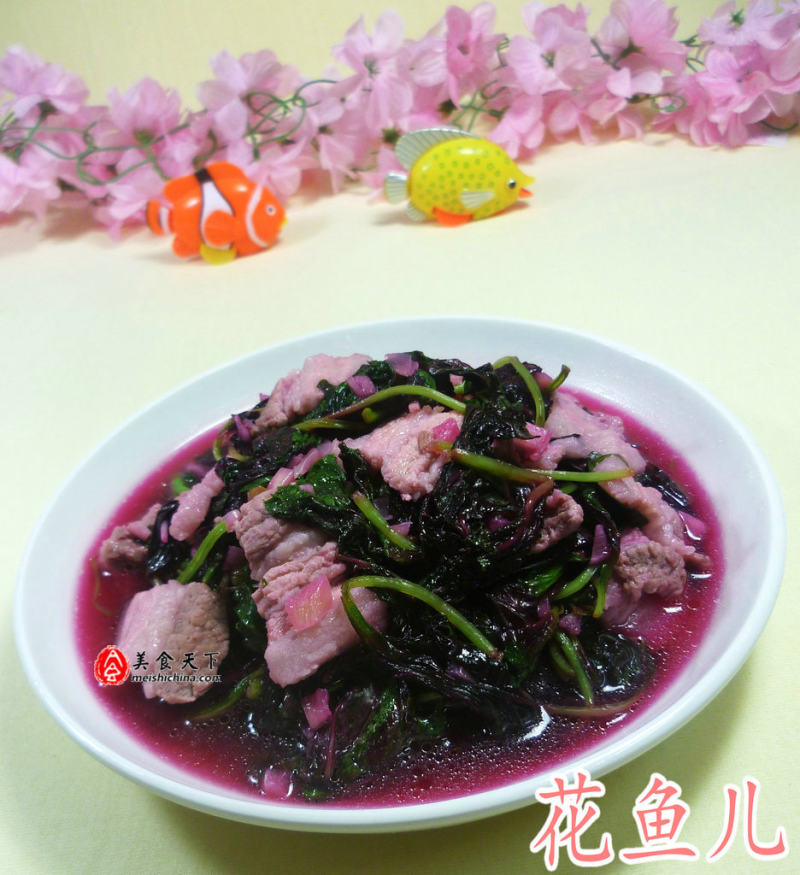 1:材料:红苋菜(已洗净)、五花肉(已切成片)、蒜末