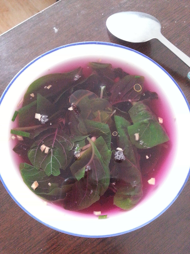 红苋菜,水一滚开就成熟,汤汁也逐渐变红。都说冬吃萝卜夏吃姜,所以我加了姜末,不喜欢姜的可以不加姜,只享受纯纯的苋菜味道也很好。