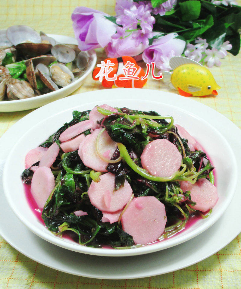 4:接着,合入切好的红苋菜翻炒翻炒。