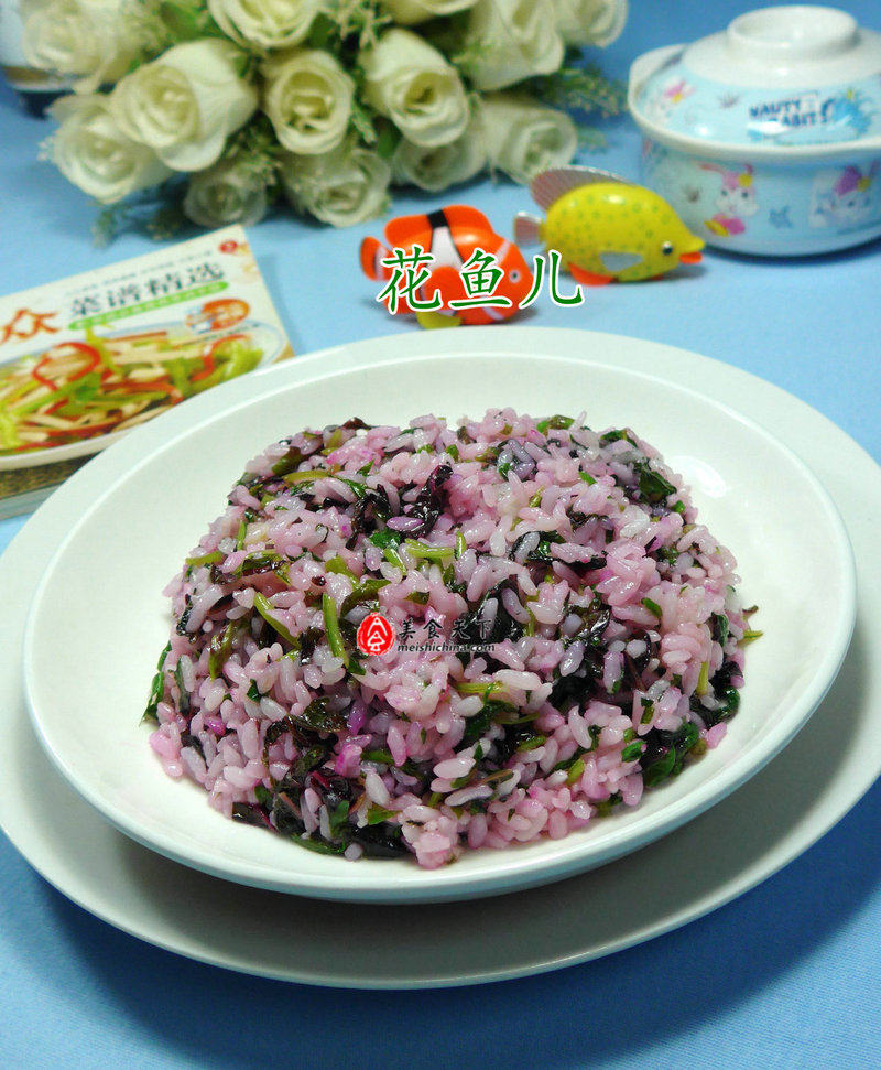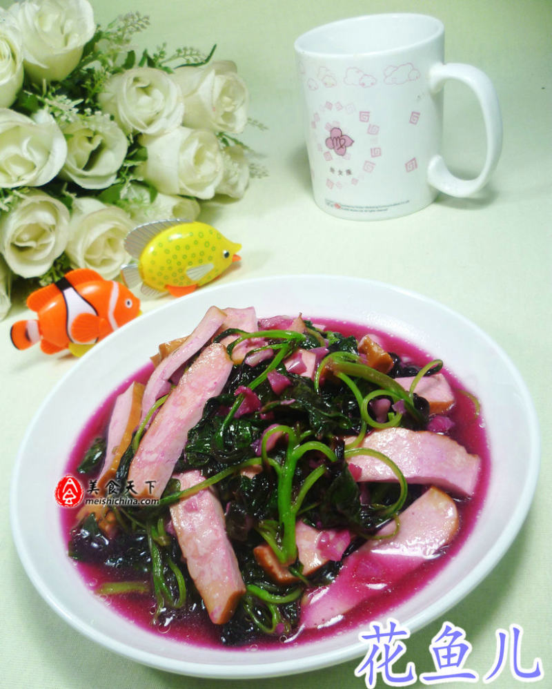 7:然后,合入已洗净好的红苋菜翻炒翻炒。