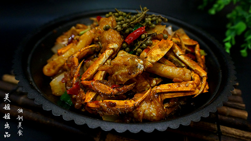 9:翻炒几下后下入刚炸好的螃蟹块一起翻炒;