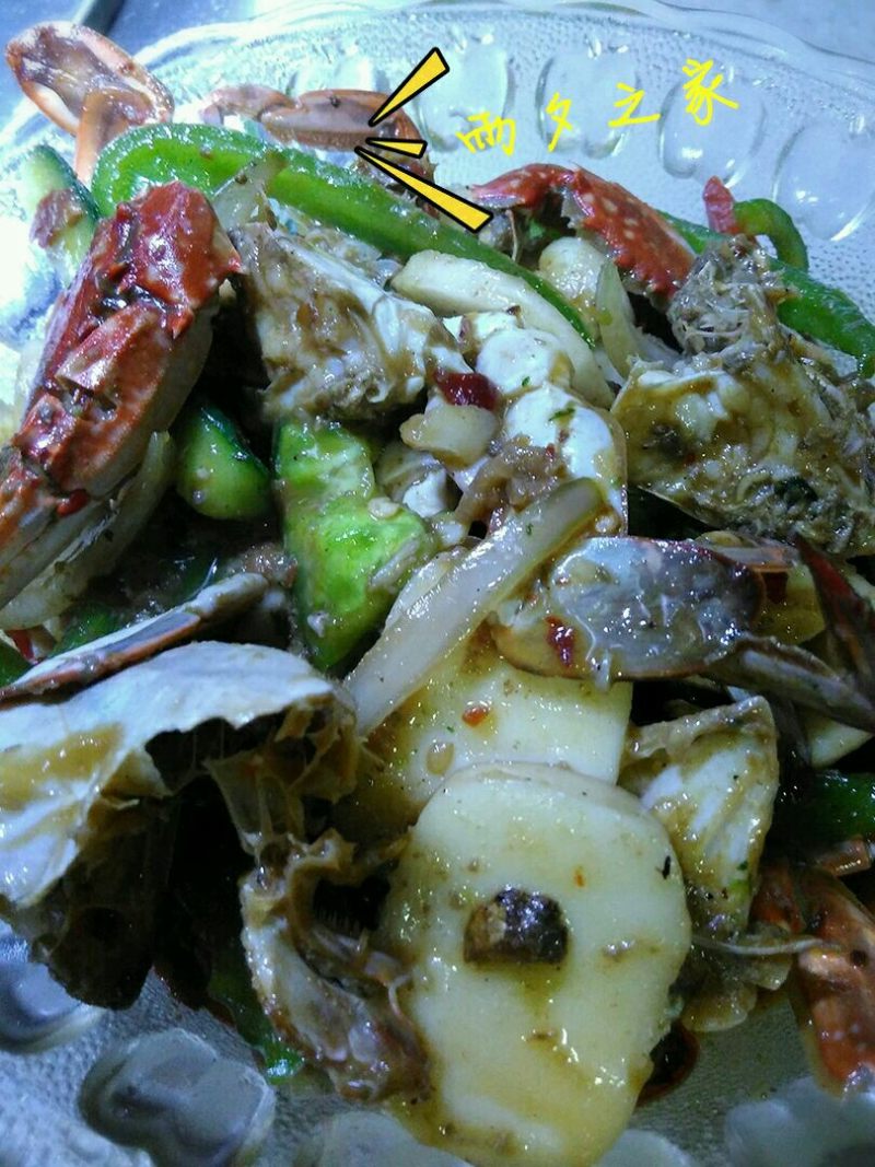 4:再倒入炸好的石头蟹和青椒:倒入耗油.黄酒.糖.翻炒均匀加一点点的水盖上锅盖5分钟而后打开锅盖继续翻炒几下加入孜然粉和葱花即可出锅香喷喷的有种烧烤的味道……