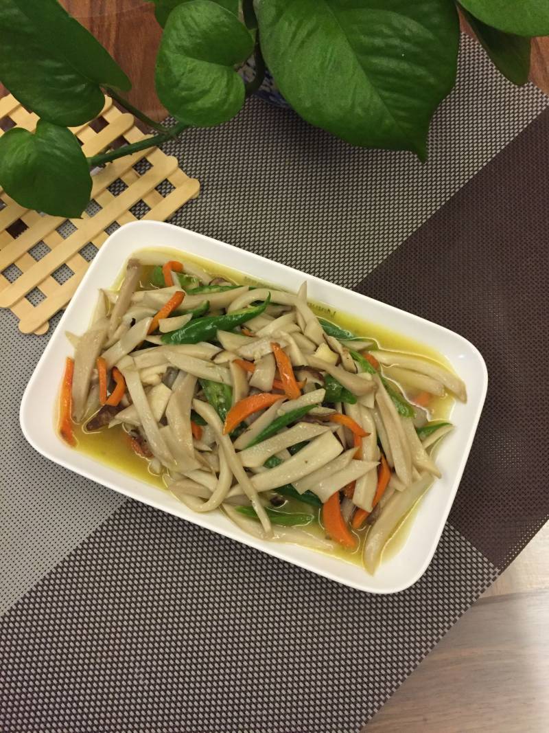 1:鸡腿菇,水中焯下;捞出,切成丝;