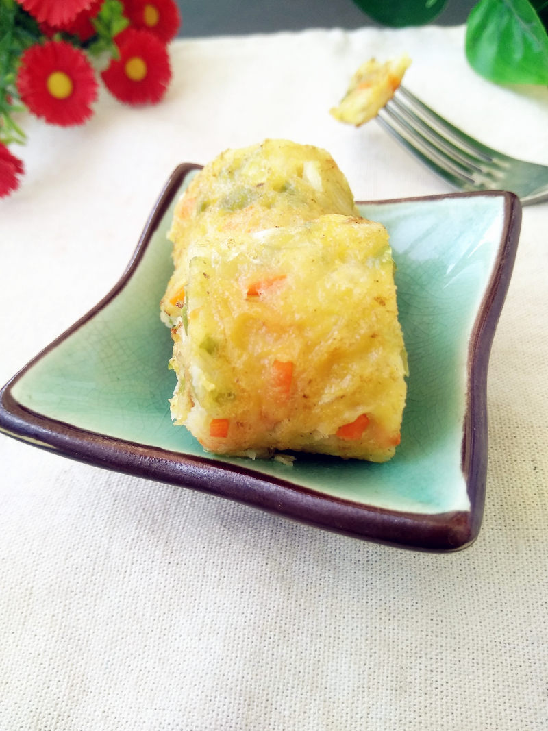 胡萝卜50g;青椒80g;圆白菜50g;小麦粉50g;玉米粉50g;鸡蛋60g;