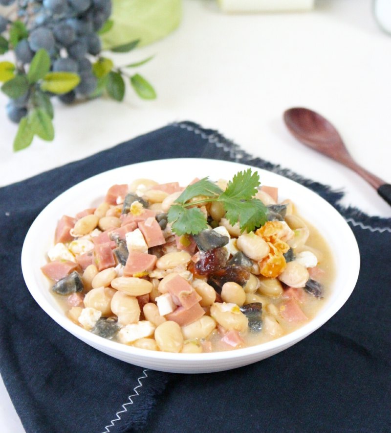 白扁豆适量;皮蛋1个;咸鸭蛋1个;火腿肠一根;