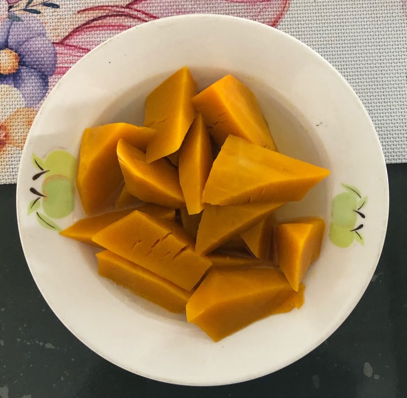 2:放入蒸格里,我是放在电饭锅里蒸的,饭熟了,南瓜也熟了。