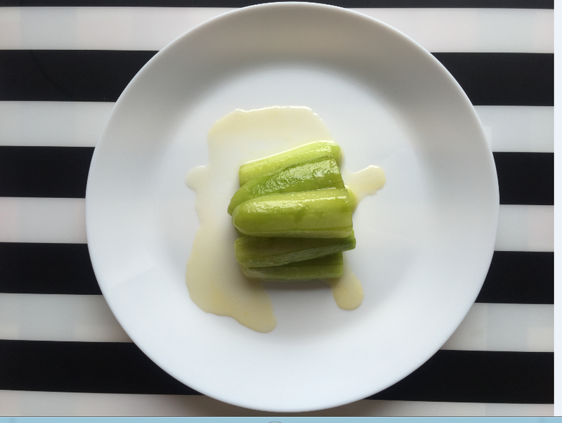 5:黄油融化,加入汆好的黄瓜条、50毫升热水,一点点盐,慢慢煨煮。