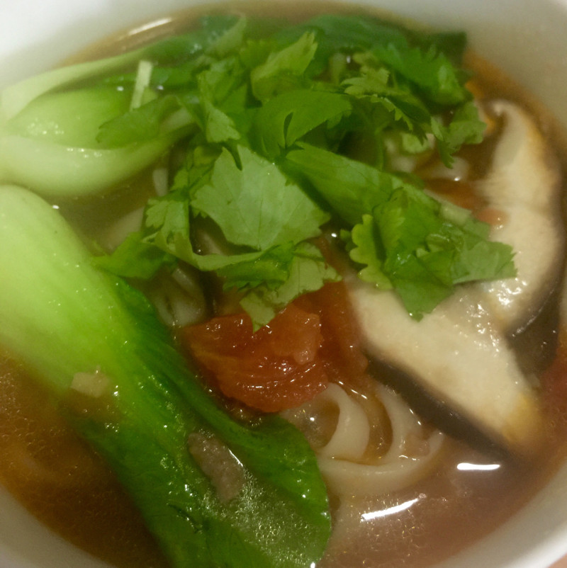 挂面180克;蕃茄1个;油菜2棵;香菇2个;牛肉馅20克;