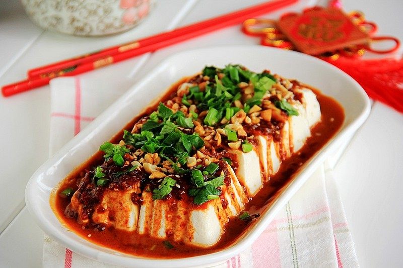 5:蒸好的豆腐倒掉蒸出的水份,用小刀划几刀,倒入调好的酱汁,撒上花生碎、芝麻和香菜即可
