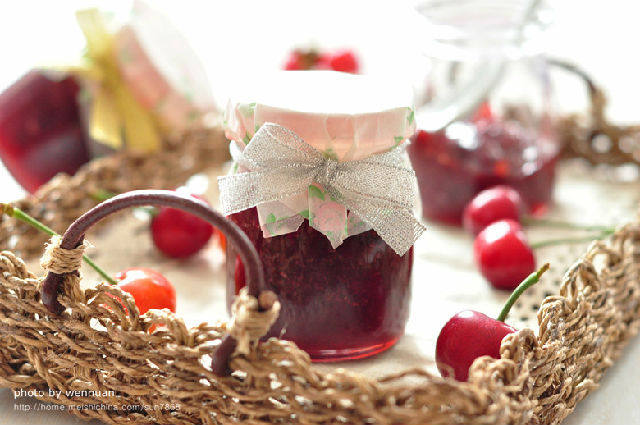 装果酱的瓶子事先要用开水烫一下后控干水分。熬煮果酱不必到汤汁全部收干,樱桃中析出的果胶会使果酱冷藏后变的浓稠。
