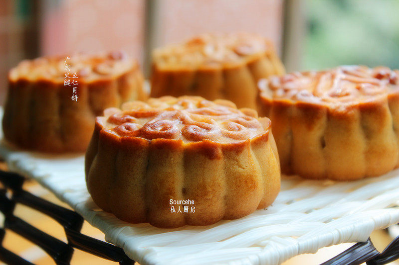 五仁火腿馅料以经典广式风味为基底,将杏仁、核桃仁、瓜子仁、芝麻仁及橄榄仁烘烤提香,搭配金华火腿的咸鲜与糖冬瓜的甜润,佐以熟糕粉、猪油及糖玫瑰调和。其制作讲究刀工匀细、火候精准,成品咸甜交织、果仁酥脆、火腿醇厚,是中秋月饼中层次丰富、回味悠长的传统之选。