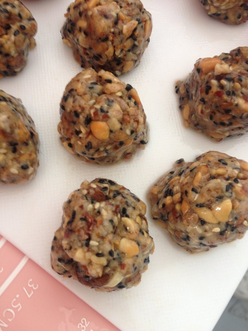 4:把坚果碎,淀粉,水,糖香油拌好可以成团即可放置一小时待用