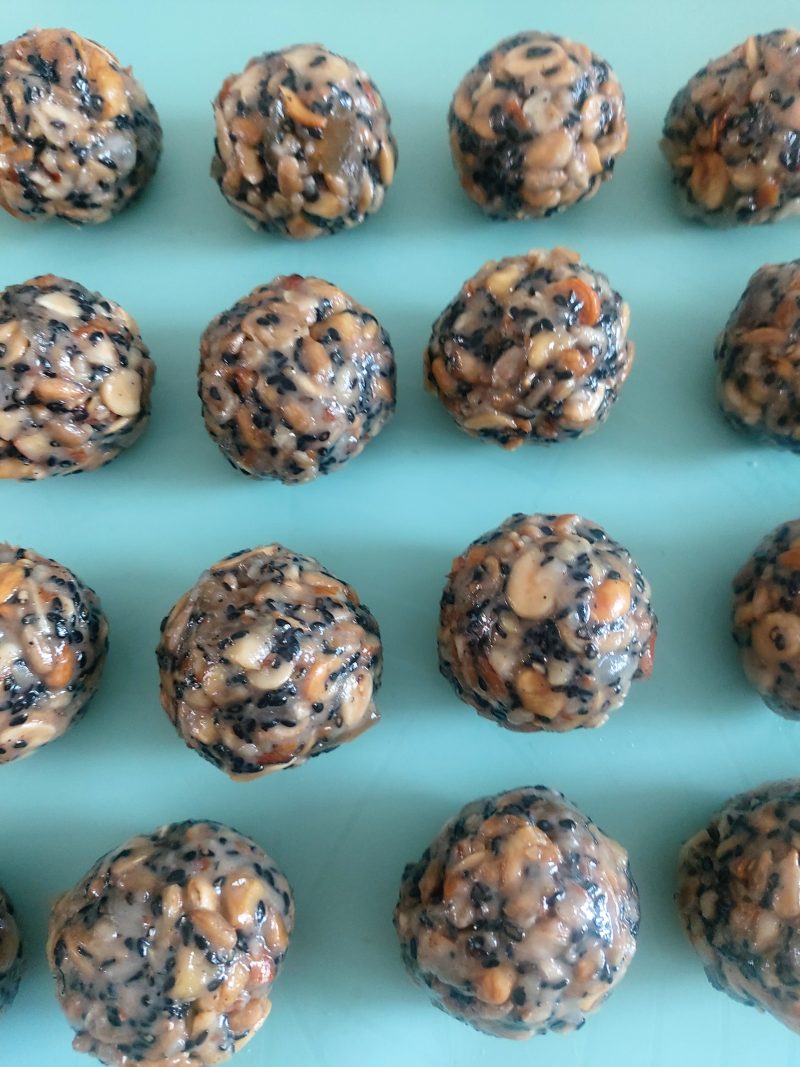 2:把所有坚果(黑芝麻、白芝麻、葵花籽人、瓜子仁、花生仁)烤熟,研碎,拌均;
