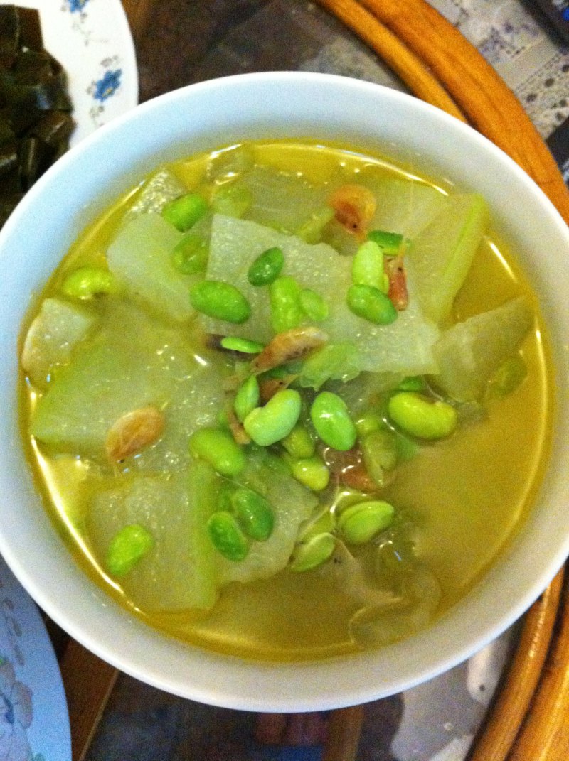 1:将冬瓜去皮切片,青椒切丝、虾米毛豆洗净待用。