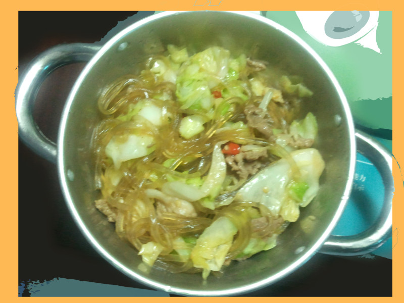 5:然后先放碎肉和蒜米辣椒一起炒热再加备用的旱藕粉丝和包菜。然后出锅。味道弹性,可口