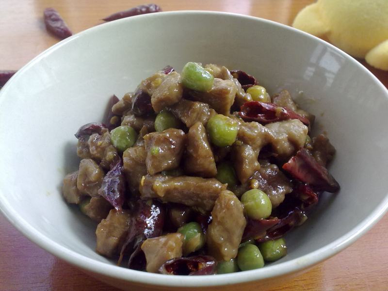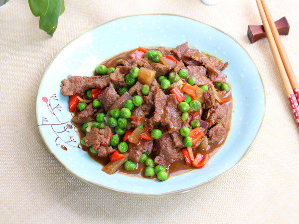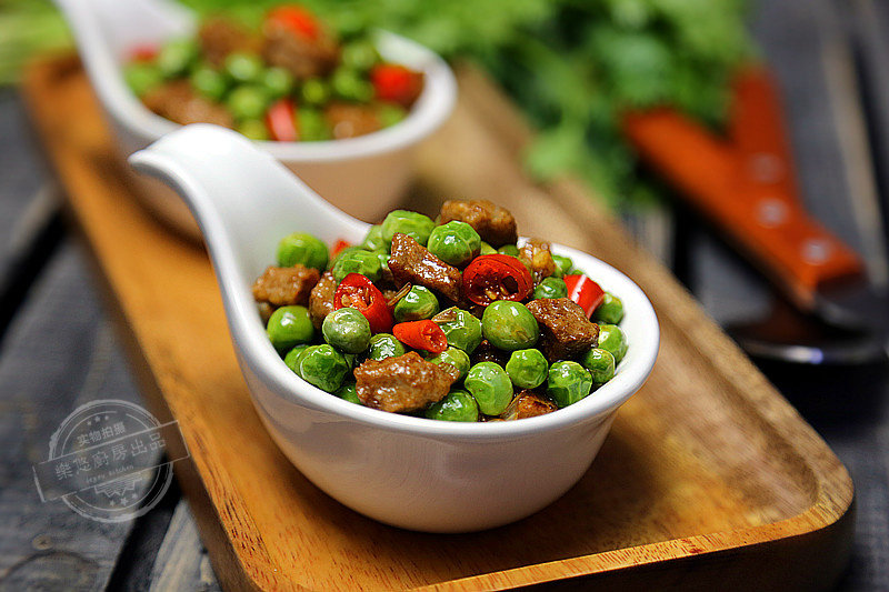 10:待牛肉七八成熟时倒入豌豆一起翻炒,最后放盐、鸡精调味即可