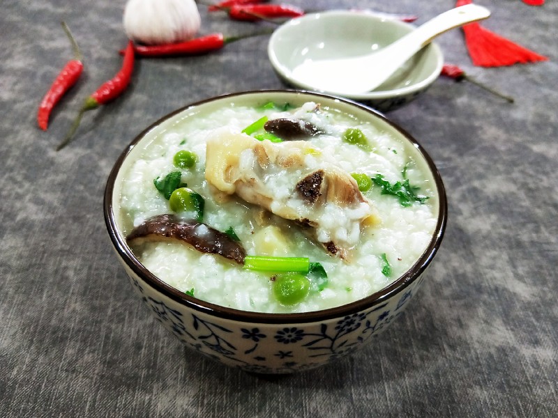 大米适量;鸡半个;豌豆100g;瑶柱20g;香菇适量;香菜适量;