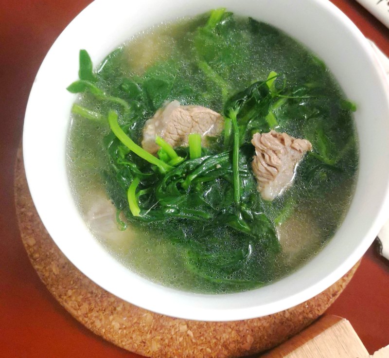 6:牛肉炖烂后加食盐,再煮十分钟后改大火将豌豆苗放入锅中。