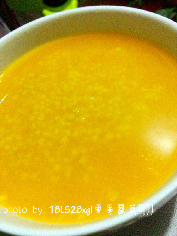 5:30分钟后,加入南瓜糊同煮,继续煮15分钟左右即可,中间要时时搅一搅,避免粘锅。小米煮熟,即可起锅。