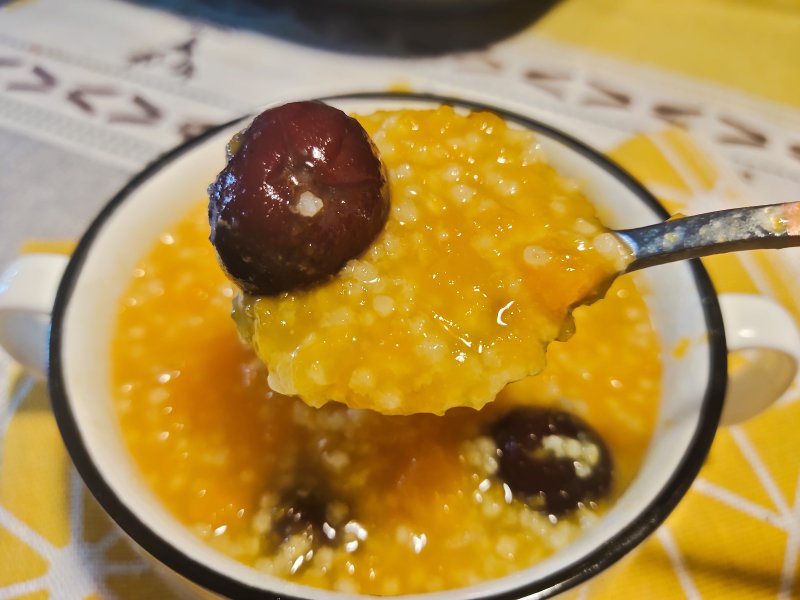 4:一次性加入南瓜荷红枣,红枣可以用比较大颗的,在粥煮好以后捞出去,这样粥中也会有淡淡的红枣香甜的味道。