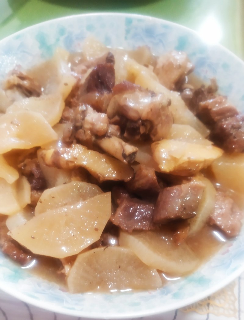 5:鸭肉牛腩熟糯时下白萝卜继续焖。