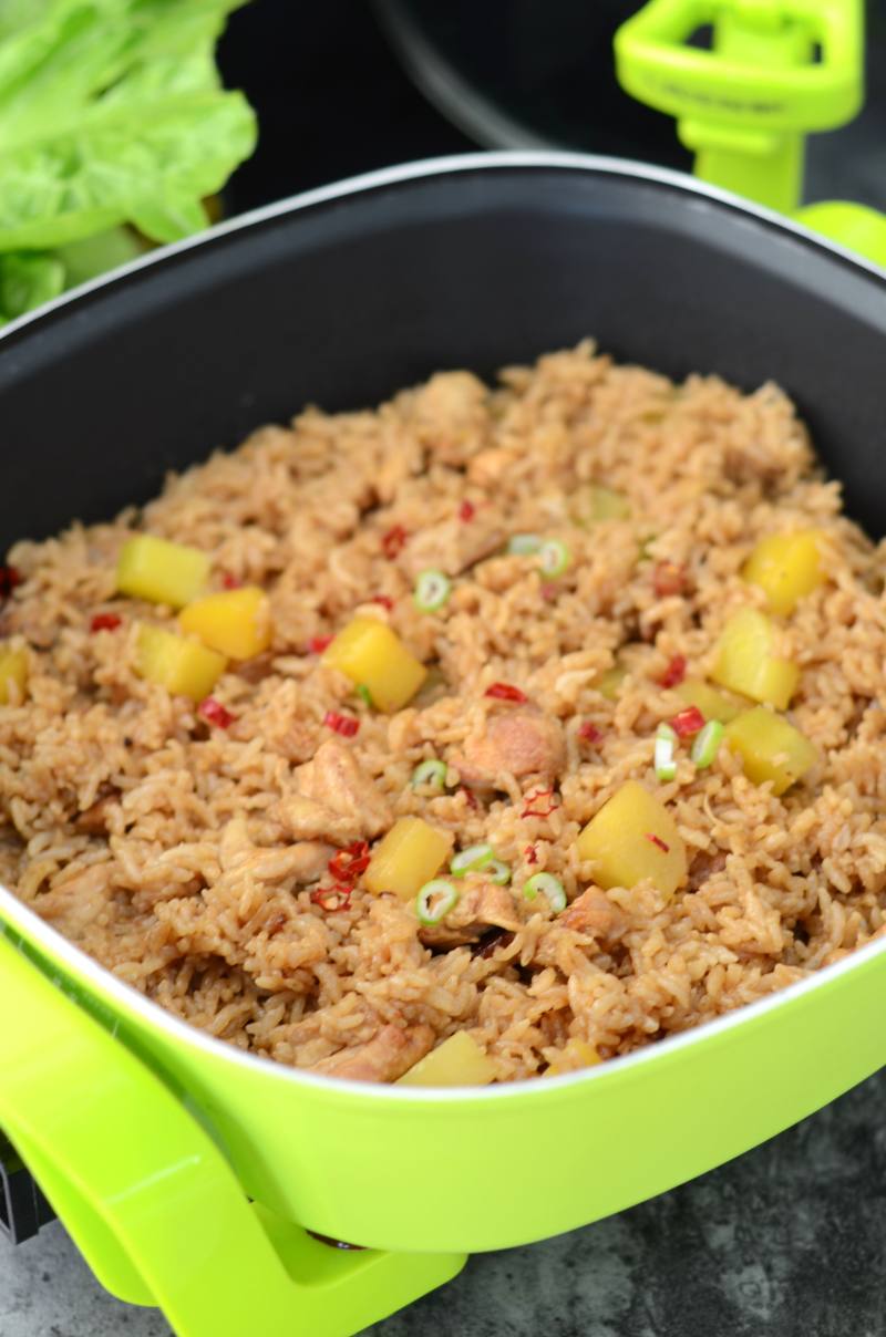 8:饭焖好后,放入红椒碎、葱末,翻拌均匀即可享用!