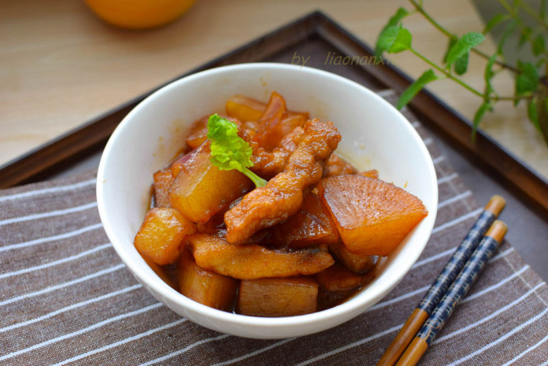 4:炒到猪肉分泌油脂,加入萝卜片,焖10分钟左右即可