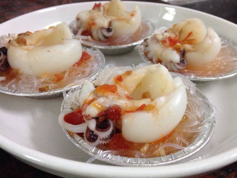 7:摆上墨鱼仔再淋上甜辣酱,粉丝中拌点甜辣酱更好,这样让它腌制一下好入味。