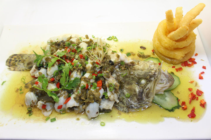 7:鱼蒸熟后端出来,洒上葱花、香菜、红椒粒即可食用