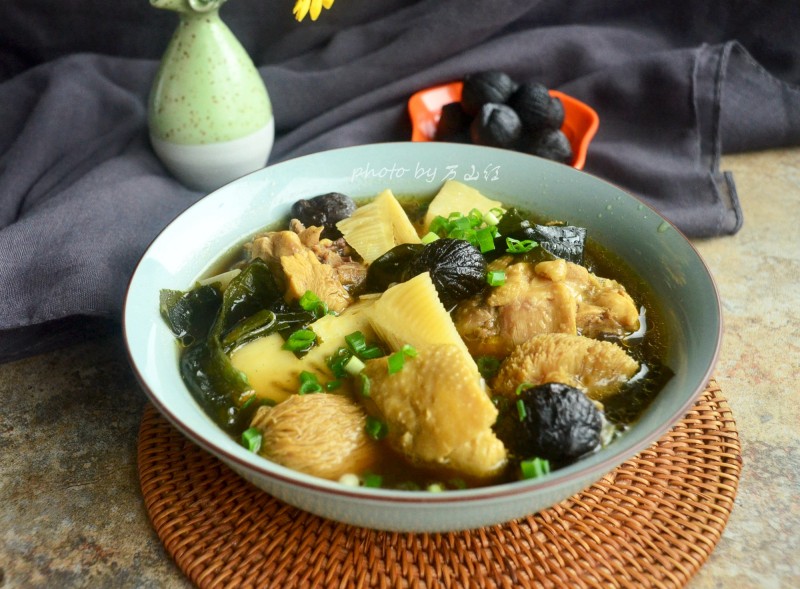 鸡腿1个;猴头菇30g;竹笋150g;裙带菜10g;黑蒜6颗;