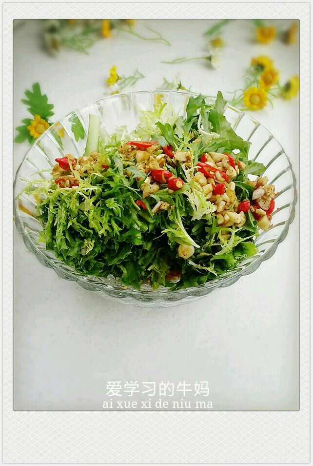 5:朝天椒爆香后连油淋在事先拌好的苦菊上面。(注意,一定要淋在大蒜蓉上面,才香)